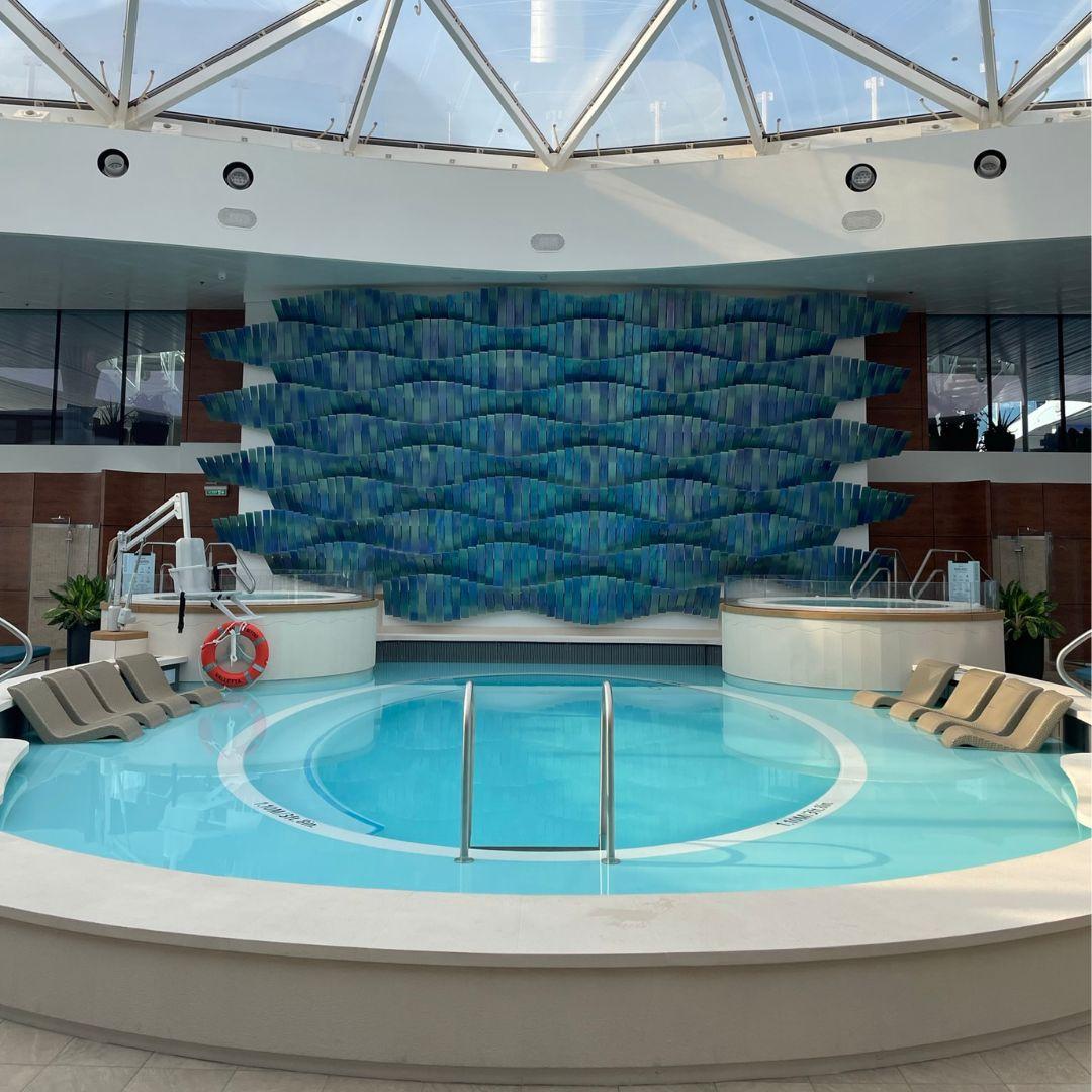 We boarded the ship and immediately were immersed in the swanky ambiance that can only be found on a Celebrity Cruise Ship. The gorgeous martini bar that extends over three stories of the ship is the focal point of the ship and the central hub for all activity. Live music is often played here throughout the day and at night the LED chandelier lights up and puts on a grand show alongside the bartenders at the martini bar underneath. We loved hanging out here!