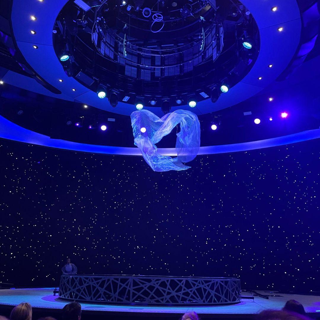 When we arrived at the Theatre before the performance of Elements during our preview cruise, we were entranced by a floating silk cloth that was floating through the air thanks to a fan in the stage. Not only was it pretty to watch, but it was captivating! The entire audience was enamored with this from the moment they sat down until the show started.
